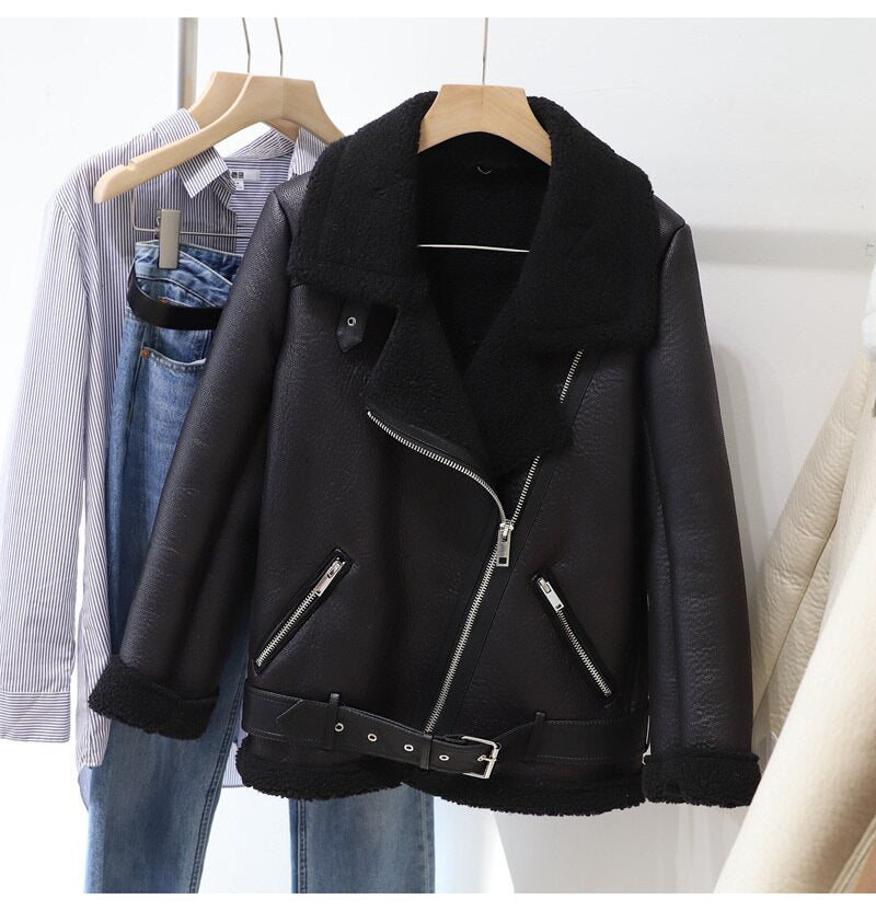 FTLZZ New Winter Women Female Fur Leather JacketFaux Lamb Leather Jacket Aviator Jacket Thick Faux Leather Fur Sheepskin Coat