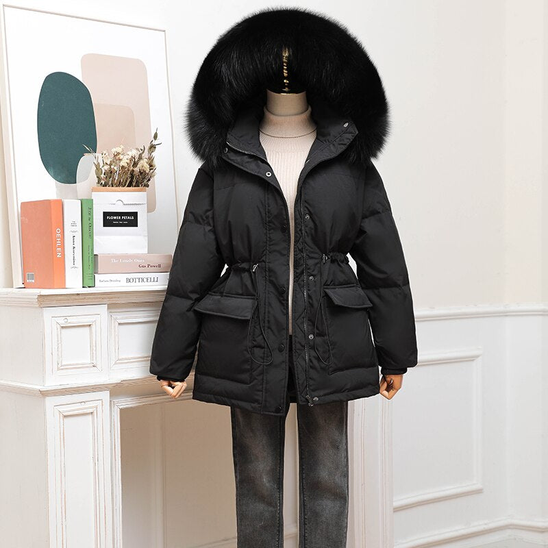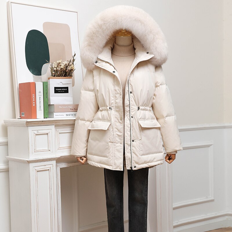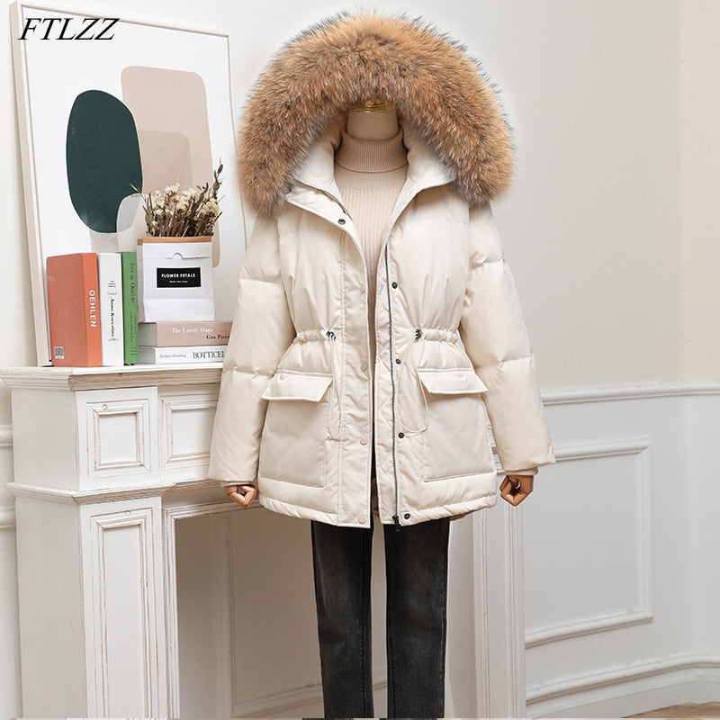 FTLZZ New Winter Women Thick Warm Large Real Fur Hooded Down Jacket 90% White Duck Down Coat Waist Retractable Parker Overcoat