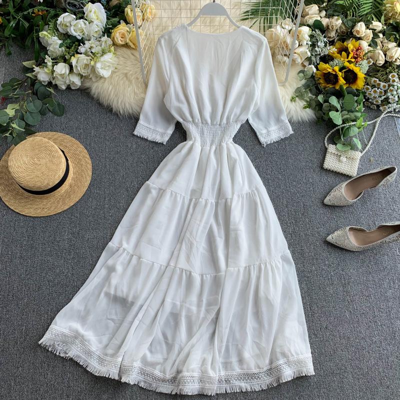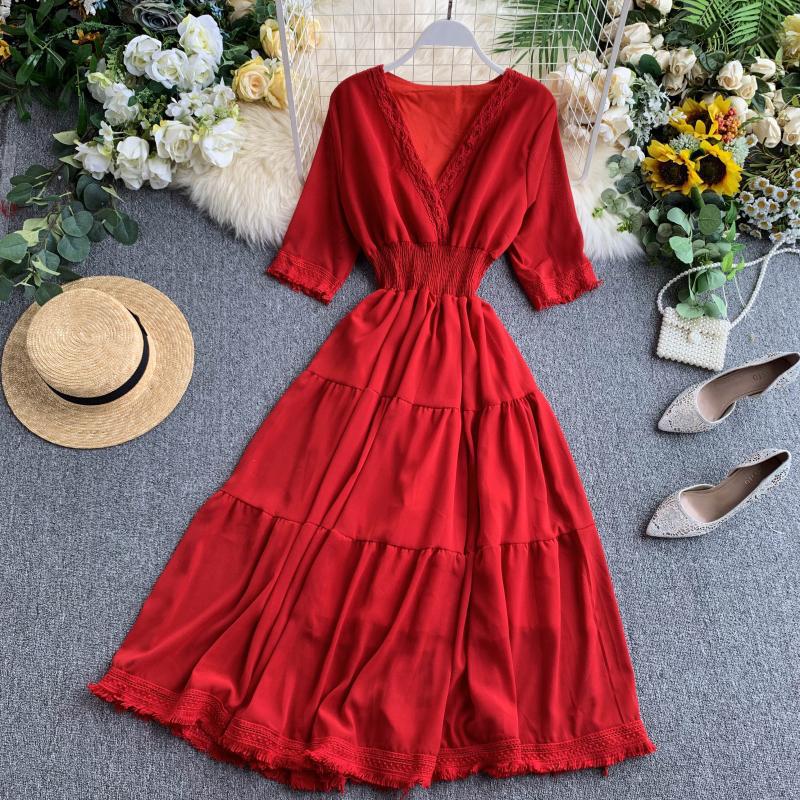 FTLZZ Red White Hollow Out Patchwork Dress Elegant V Neck Retro Women Midi Dress Summer Vintage A Line Beach Vestido