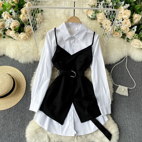 FTLZZ Summer New Arrival Office Ladies Long Sleeve White Shirt Retro Shirt Dress Sling Outside with Belt Slim Two-piece Suit