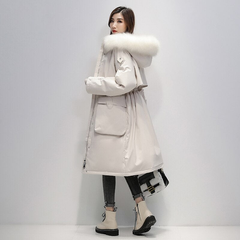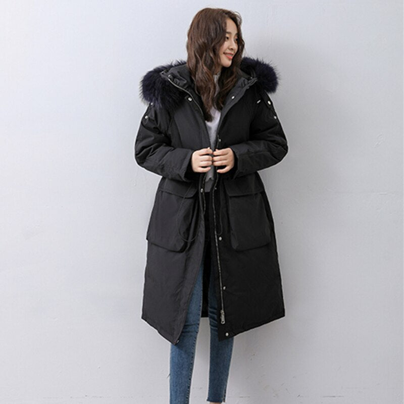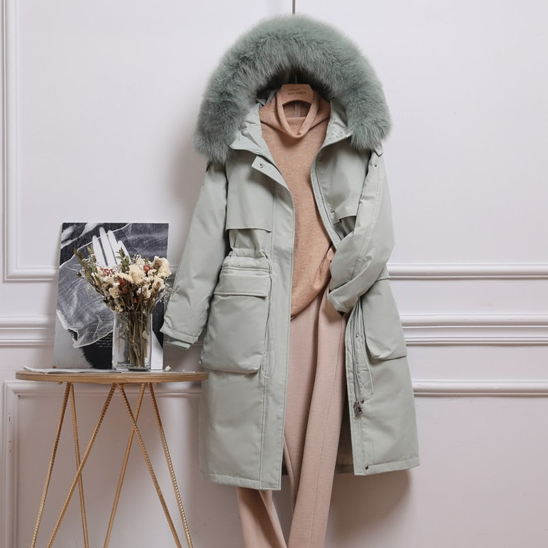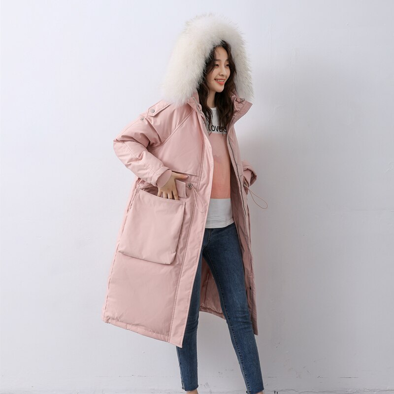 FTLZZ Winter Artificial Fur Hooded Long Jacket 90% White Duck Down Coat Big Pocket Parkas Loose Warm Jackets Yellow Snow Outwear