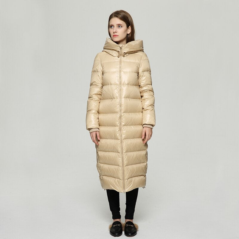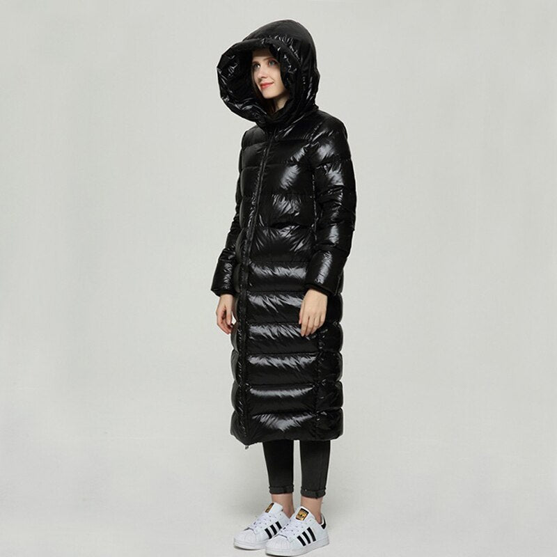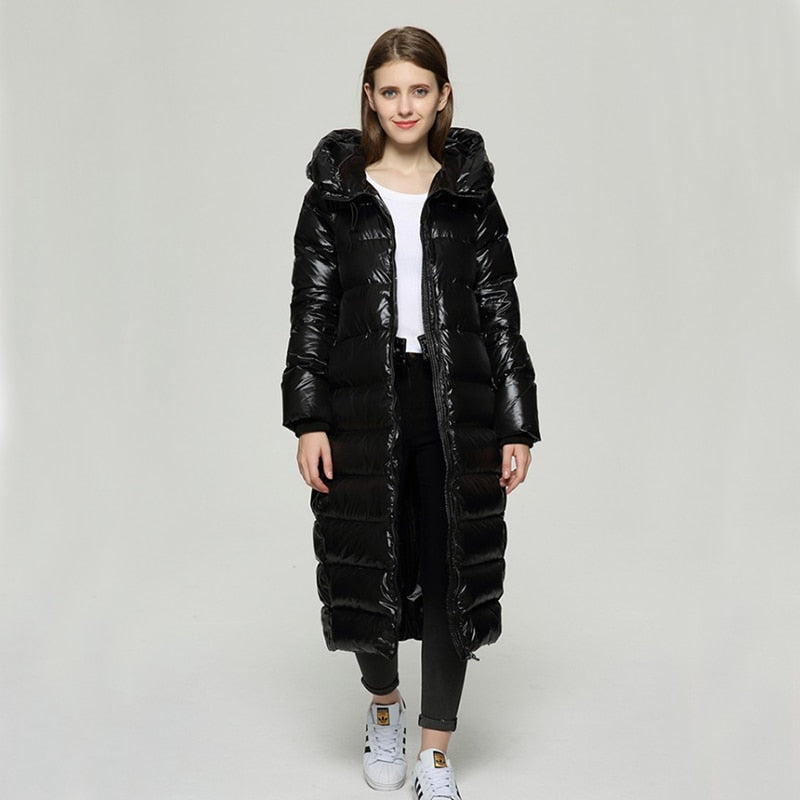 FTLZZ Winter Hooded Patent Leather Long Jacket Women Loose Thick Warm Snow Parkers White Duck Down Coat Waterproof Outwear