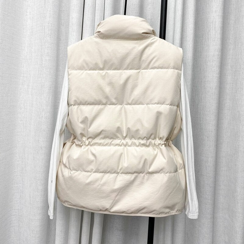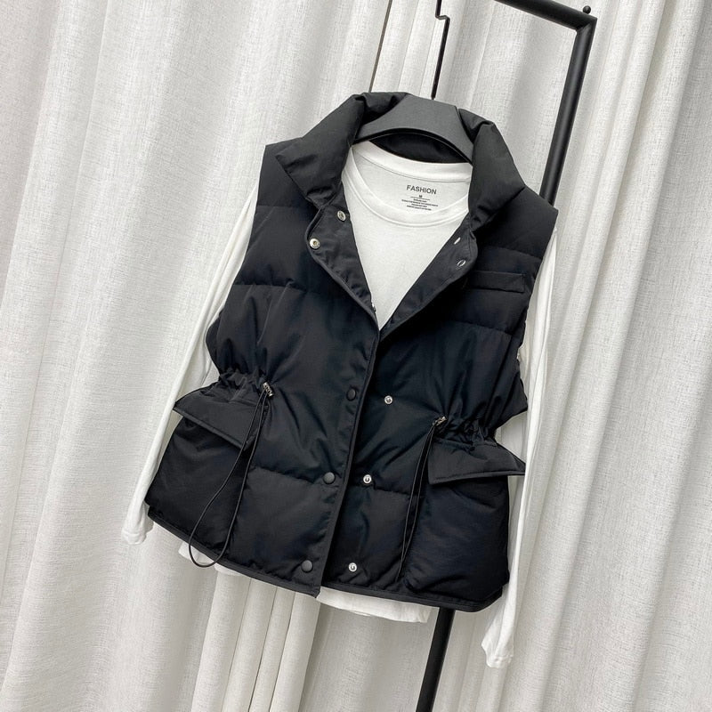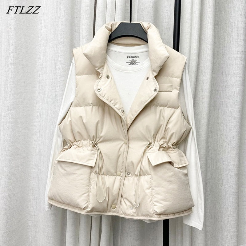 FTLZZ Winter Single Breasted Light Down Short Vest Jacket Women White Duck Down Coat Waist Retractable Pocket Sleeveless Outwear
