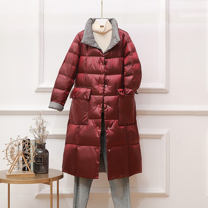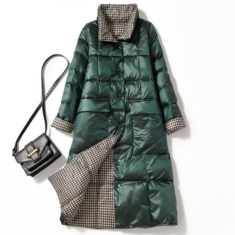 FTLZZ Women Double Sided Down Long Jacket Winter Stand Collar 90% White Duck Down Coat Single Breasted Thick Warm Snow Outwear