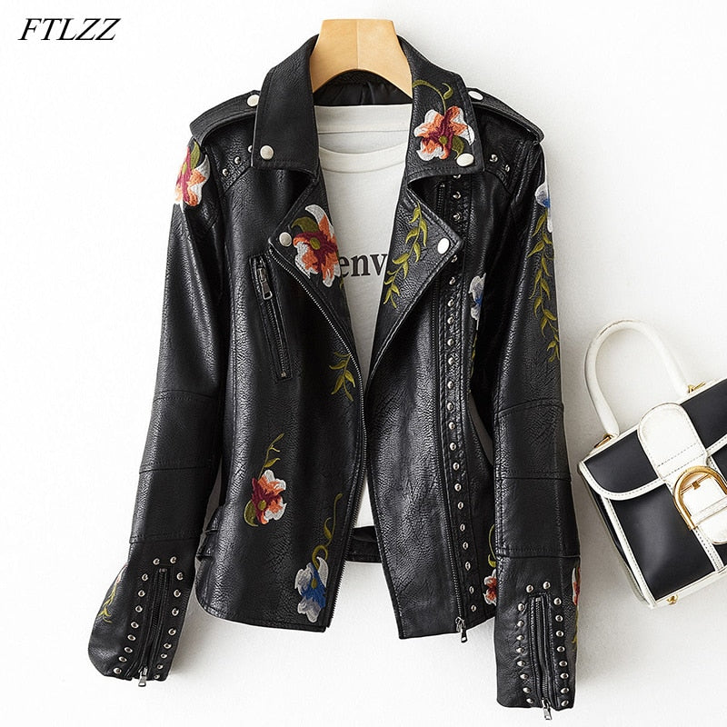 FTLZZ Women Retro Punk Style Fuax Leather Jacket Streetwear Moto Biker Embroidery Floral Print Rivet Pu Coat Oversized Outwear