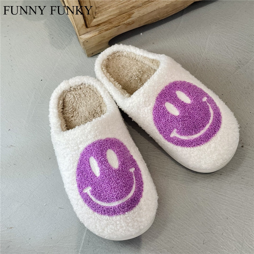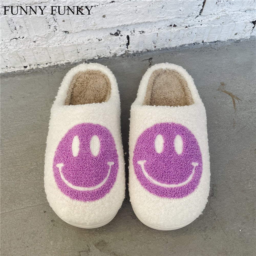 FUNNY FUNKY 2021 Winter Women's Shoes New Purple Happy Face Decor Fluffy Faux Fur Smiley Shoes for Women House Female Slippers