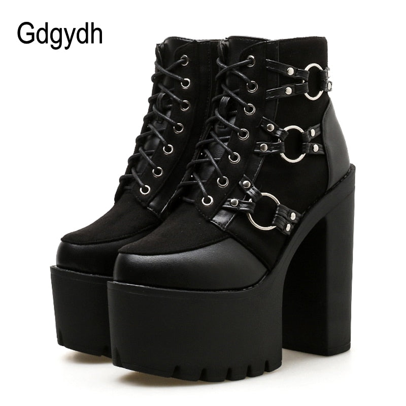 Gdgydh 2022 Spring Fashion Motorcycle Boots Women Platform Heels Casual Shoes Lacing Round Toe Shoes Ladies Autumn Boots Black