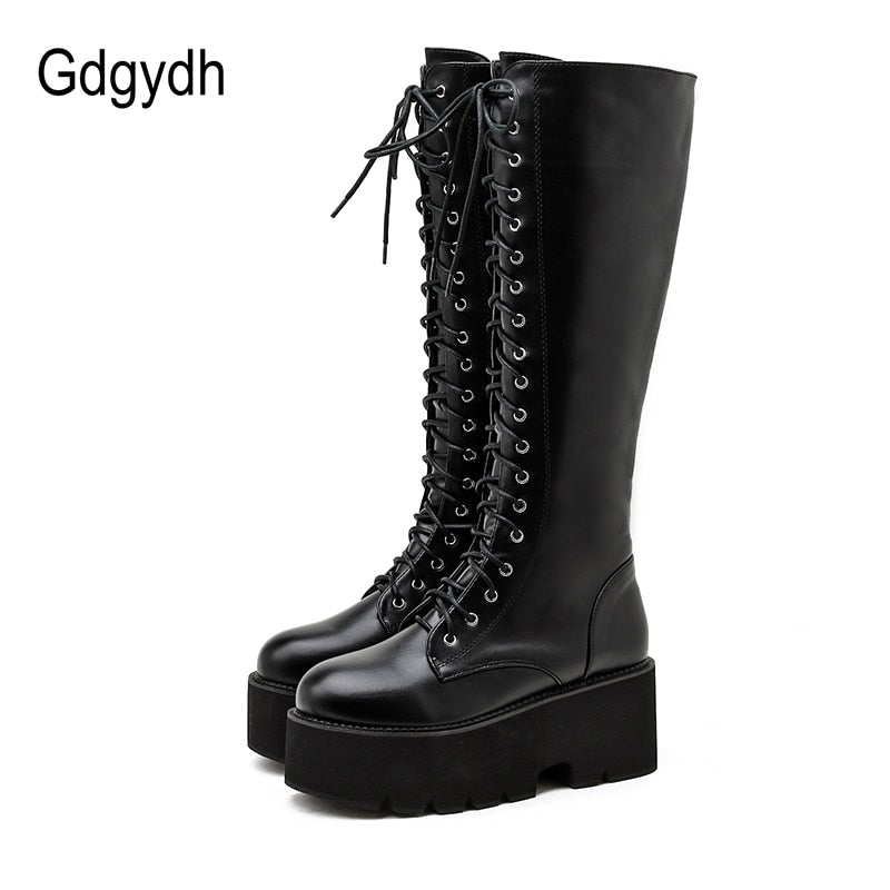 Gdgydh Chunky Platform Heels Pu Leather Knee High Boots Women Retro Punk Long Boots Woman Lace Up Booties Mujer 2021 New Fall
