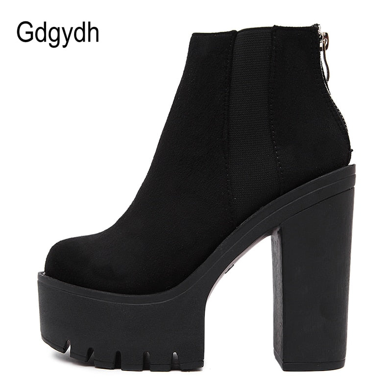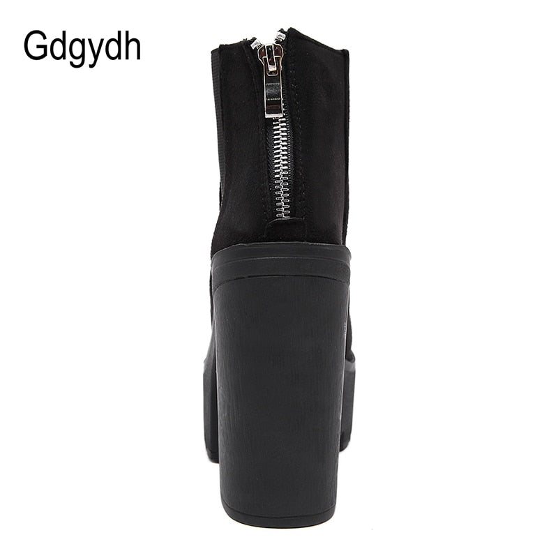 Gdgydh Fashion Black Ankle Boots For Women Thick Heels Spring Autumn Flock Platform Shoes High Heels Black Zipper Ladies Boots