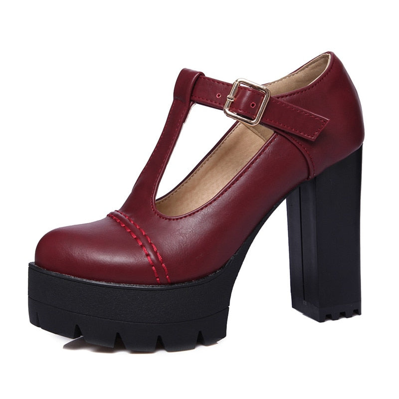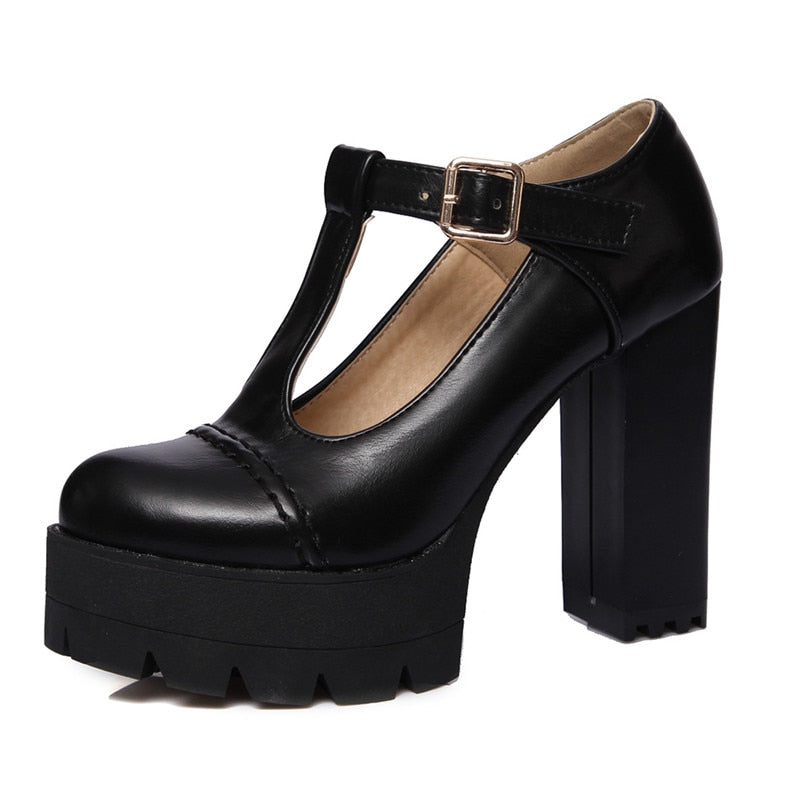 Gdgydh Fashion Women Pumps Round Toe T-starp Buckle Female Single Shoes Thick Heels Platform Women Shoes Russian Plus Size 43