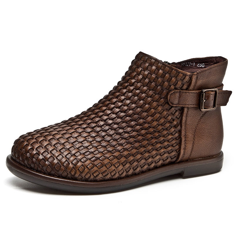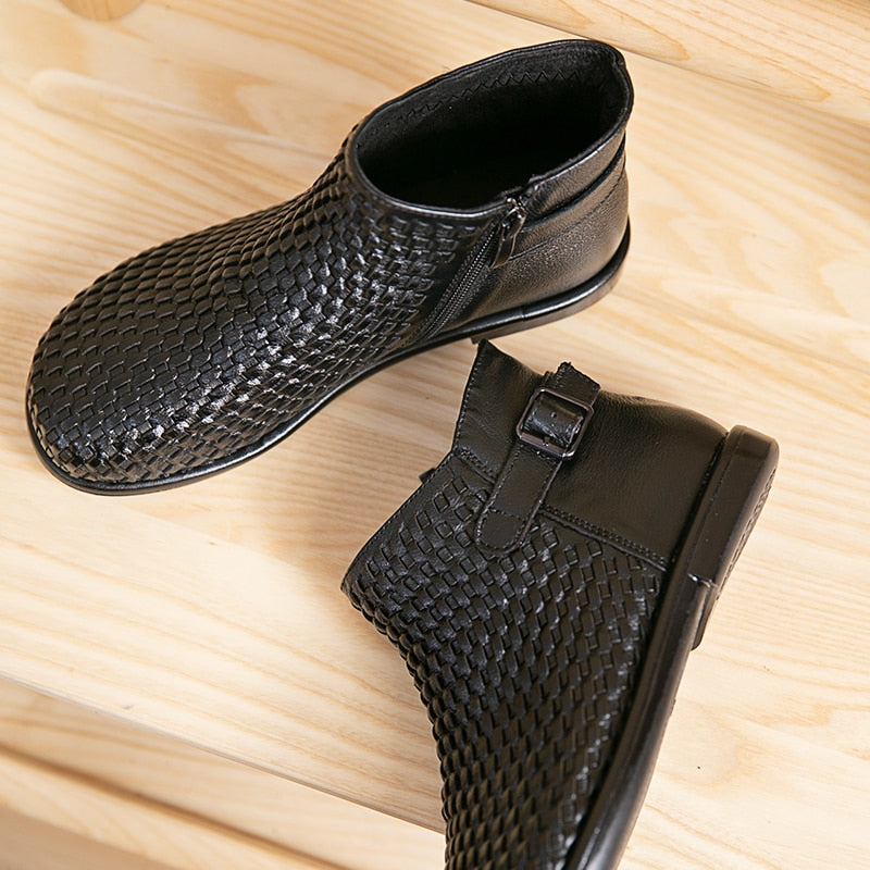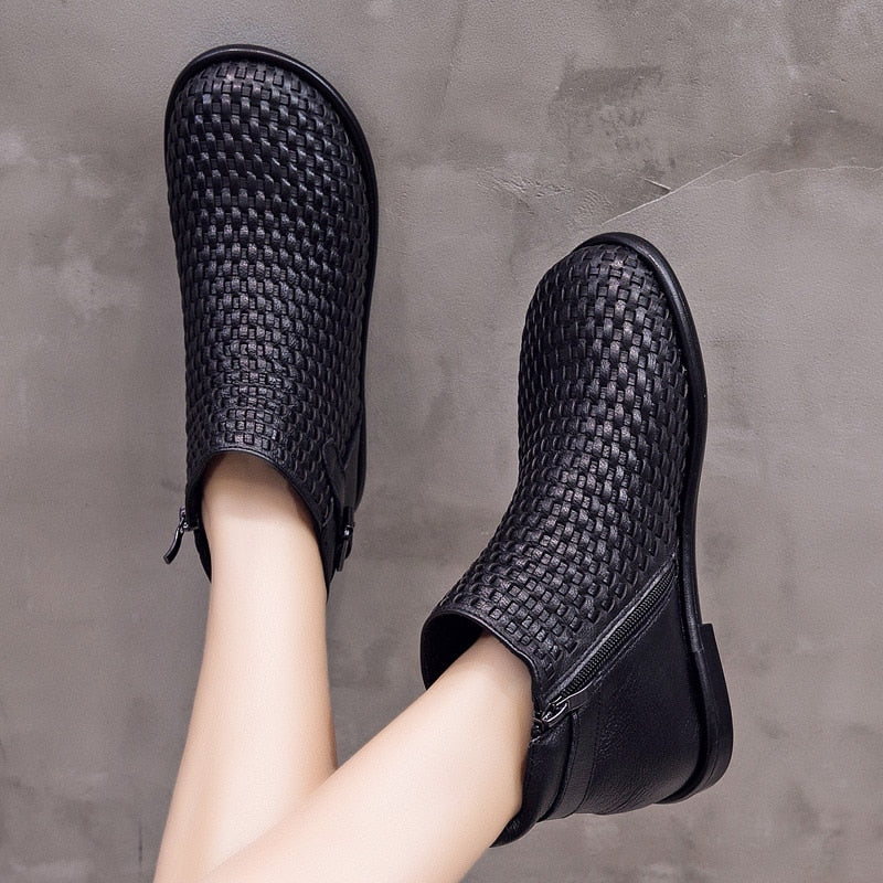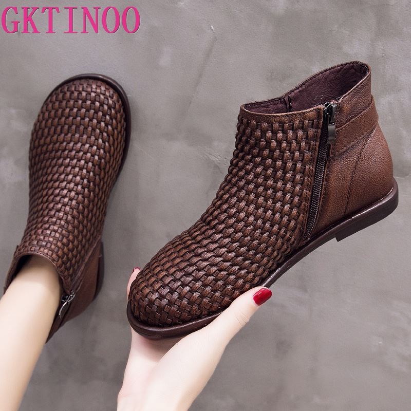 GKTINOO Boots Women short boots Woven cowhide Flat casual shoes Autumn and winter flat ankle boots brown Black ladies boots