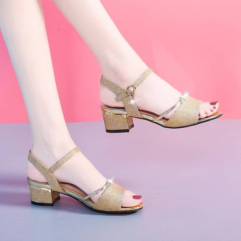 Gold Peep Toe Women Sandals Buckle Summer Fashion Ladies High Heels Sandals Square Heels Solid Basic Sandals