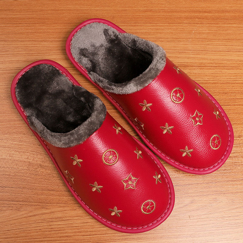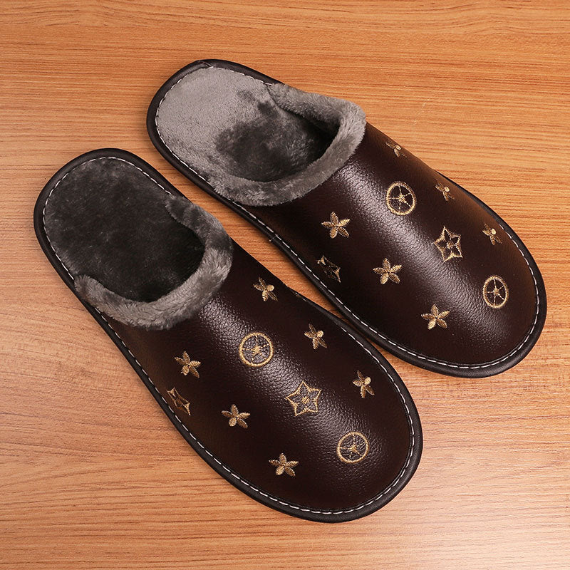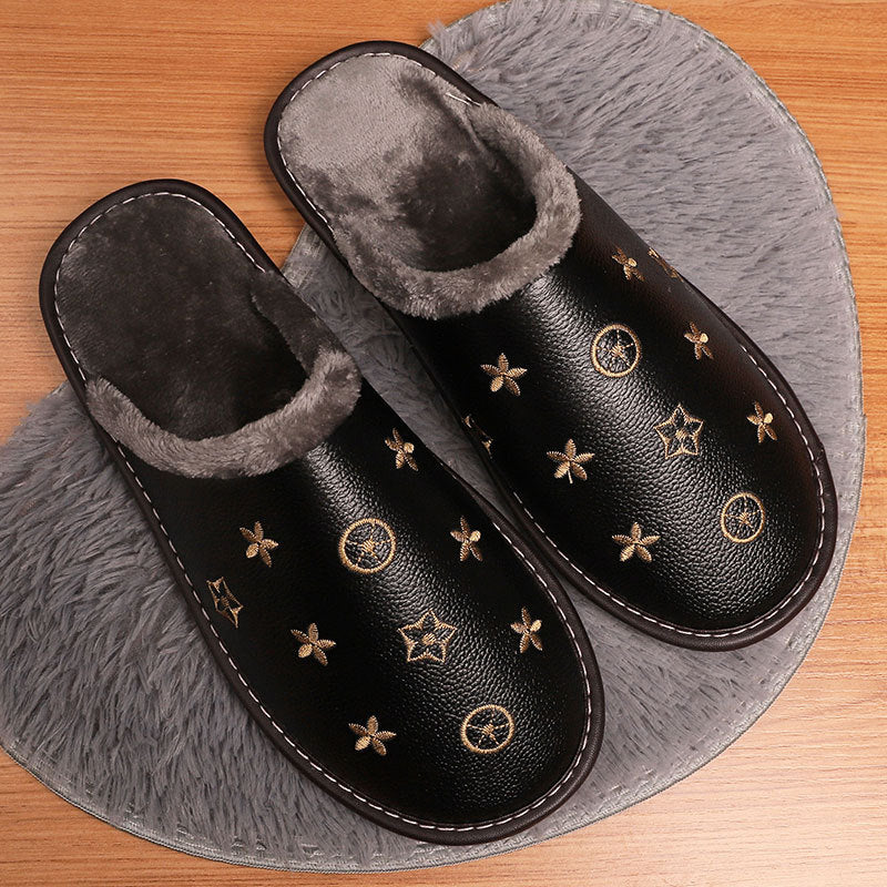 Hot Waterproof Leather Slippers Men Winter Warm Home Cotton Shoes Women Brand Luxury Indoor Fur Slippers Couple Shoes