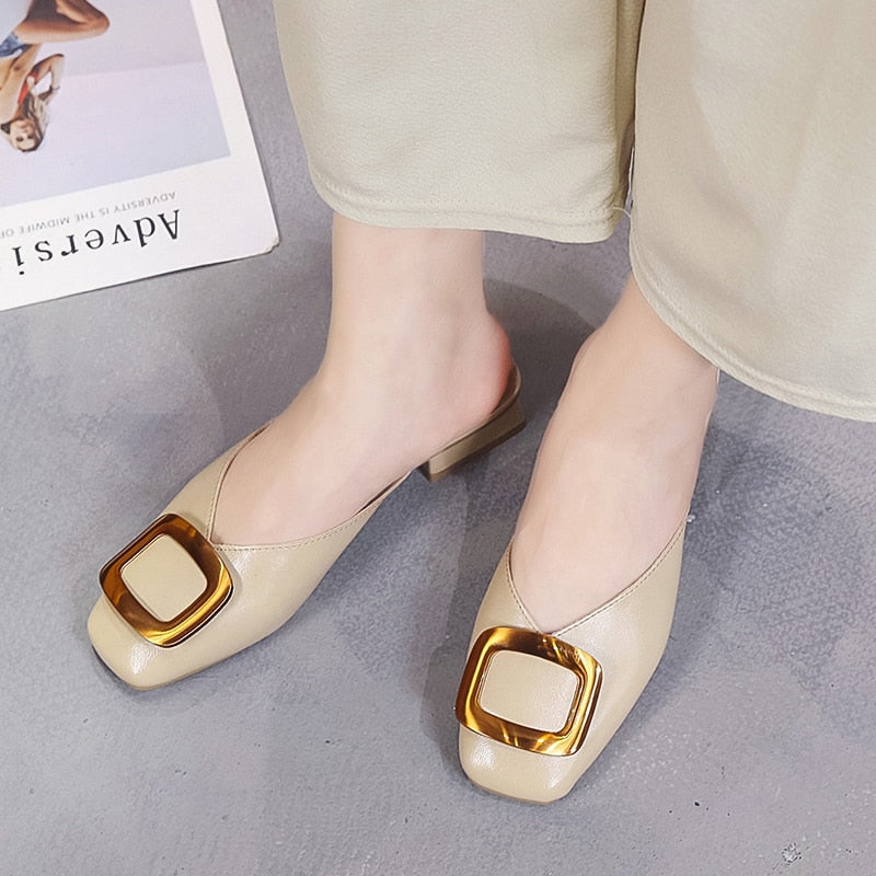 Ladies Mules Elegant Low Heel Buckle Women Slippers Slip-on Comfortable PU Ladies Office Shoes Summer Women Slippers