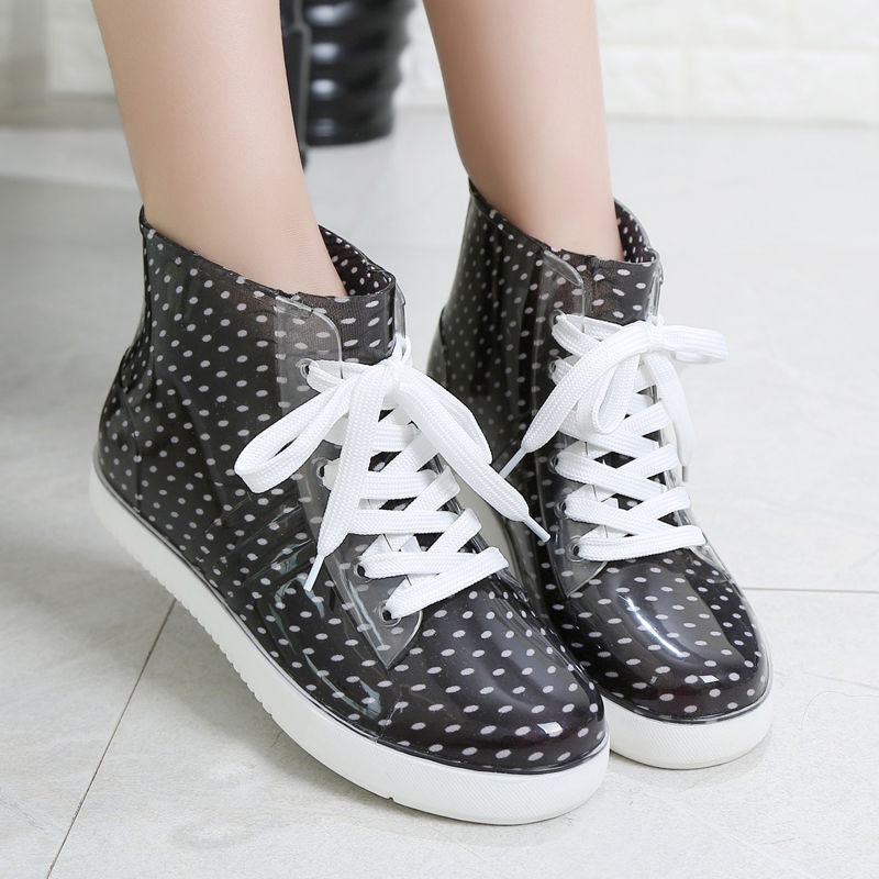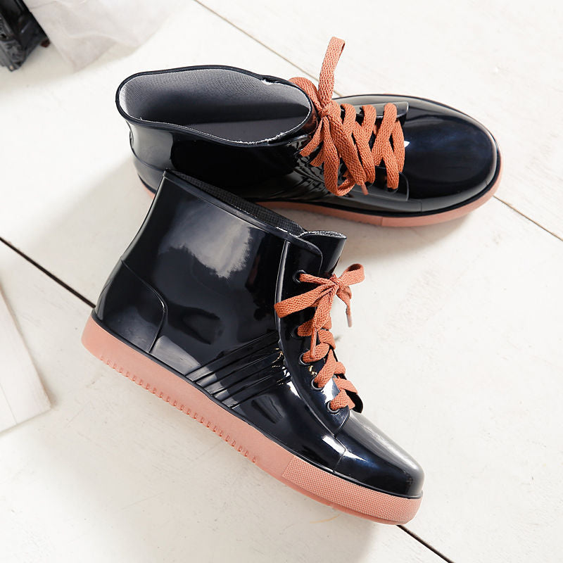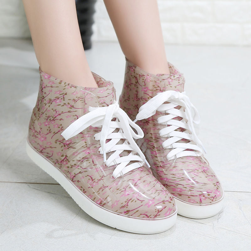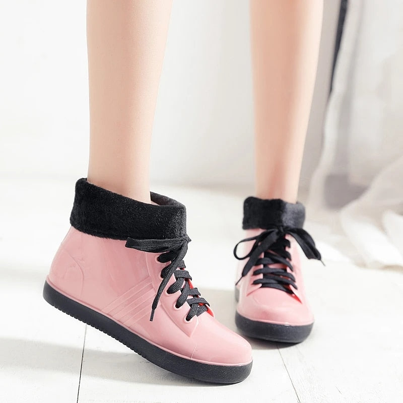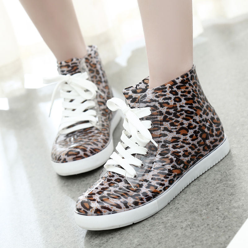 Leopard Women's Rainshoes Waterproof Non-Slip Flat Rubber Shoes Women Rain Boots Short Tube Lace Up Velvet Warmer Winter Boots