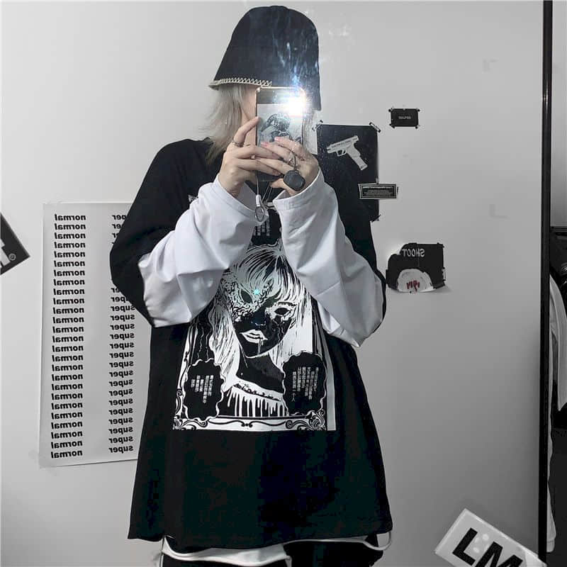 Long-sleeved T-shirt Autumn Korean Style Harajuku Bf Style Dark Girl Printing Loose Fake Two-piece Female Student Top Shirts