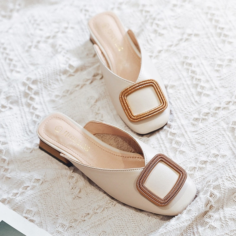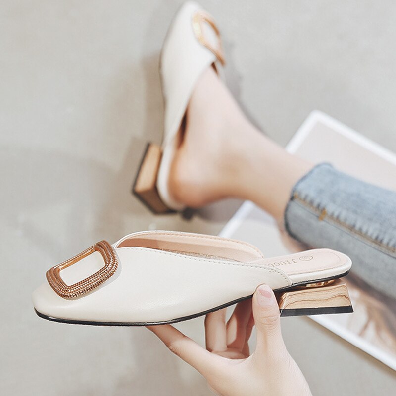 Luxury Designer Women Mules Pumps Sexy Buckle Wooden Block Heel Elegant Ladies Office Casual Shoes Party Women Slippers