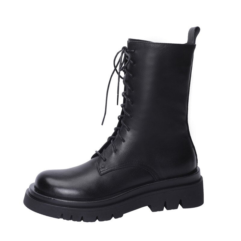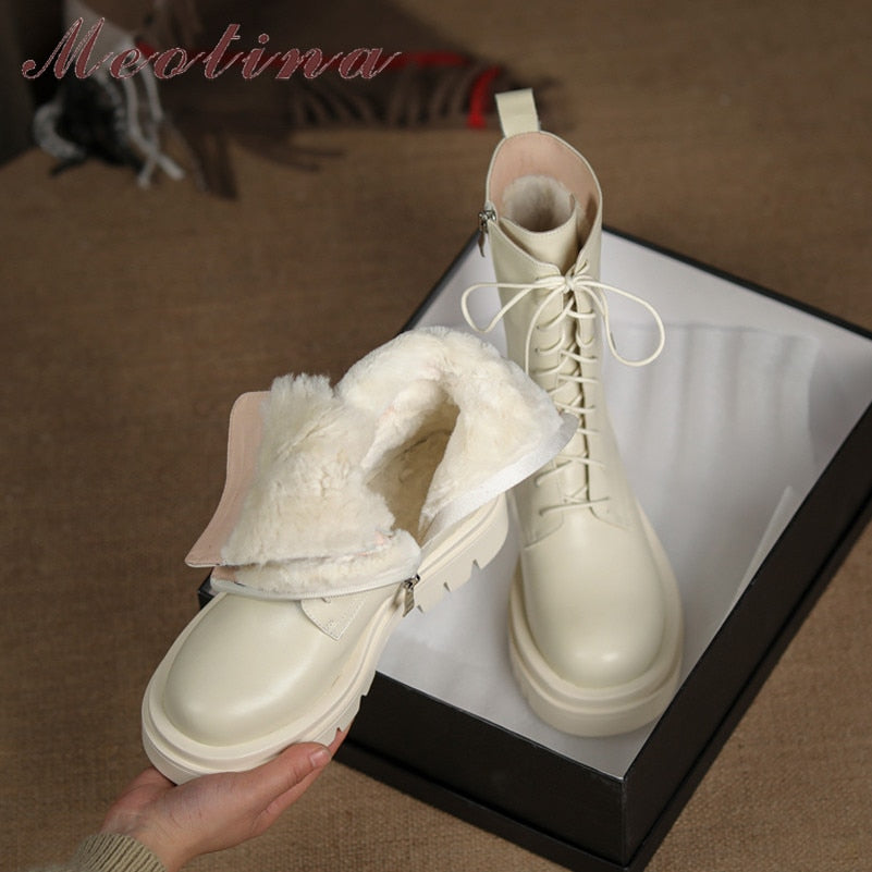 Meotina Real Leather High Heel Motorcycle Boots Woman Wool Platform Block Heel Ankle Boots Lace Up Short Boots Zip Lady Shoes 42