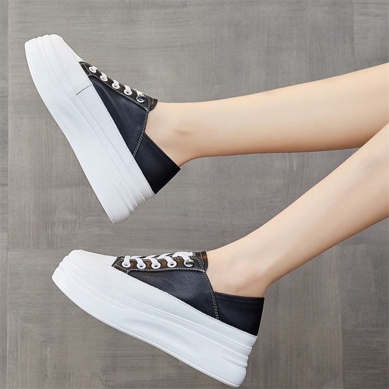 Meotina Sneakers Women Shoes Genuine Leather Flats Platform Shoes Round Toe Causal Lace Up Shoes Female Autumn Black White