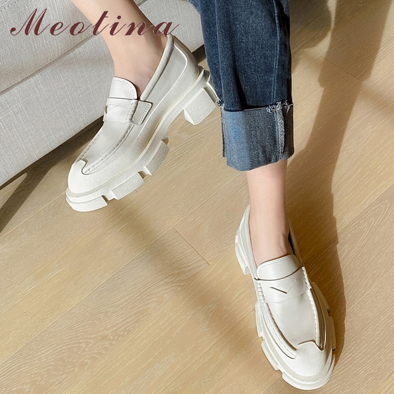 Meotina Women Genuine Leather Pumps Loafers Shoes Thick Heels Causal Platform Med Heel LadIes Footwear 2022 Spring Black 34-42