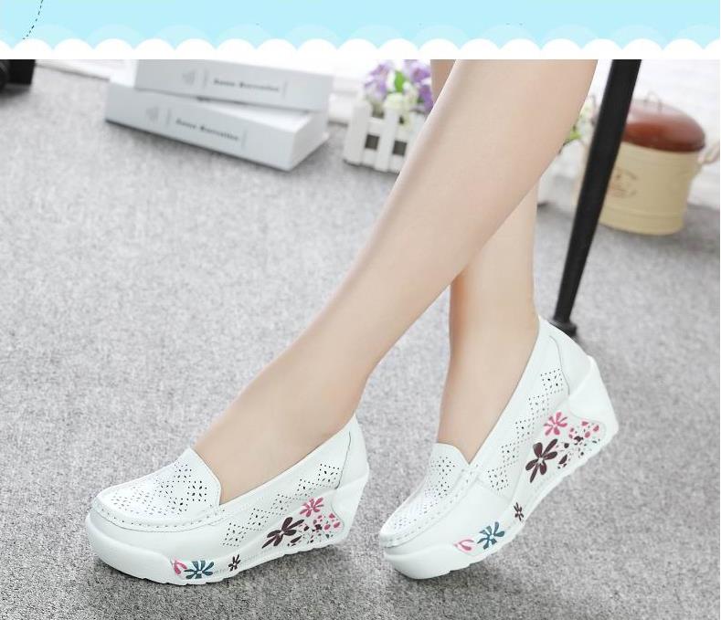 New Women's Genuine Leather Platform Shoes Wedges White Lady Hollow printing Casual Shoes Swing mother Shoes Size 35-40
