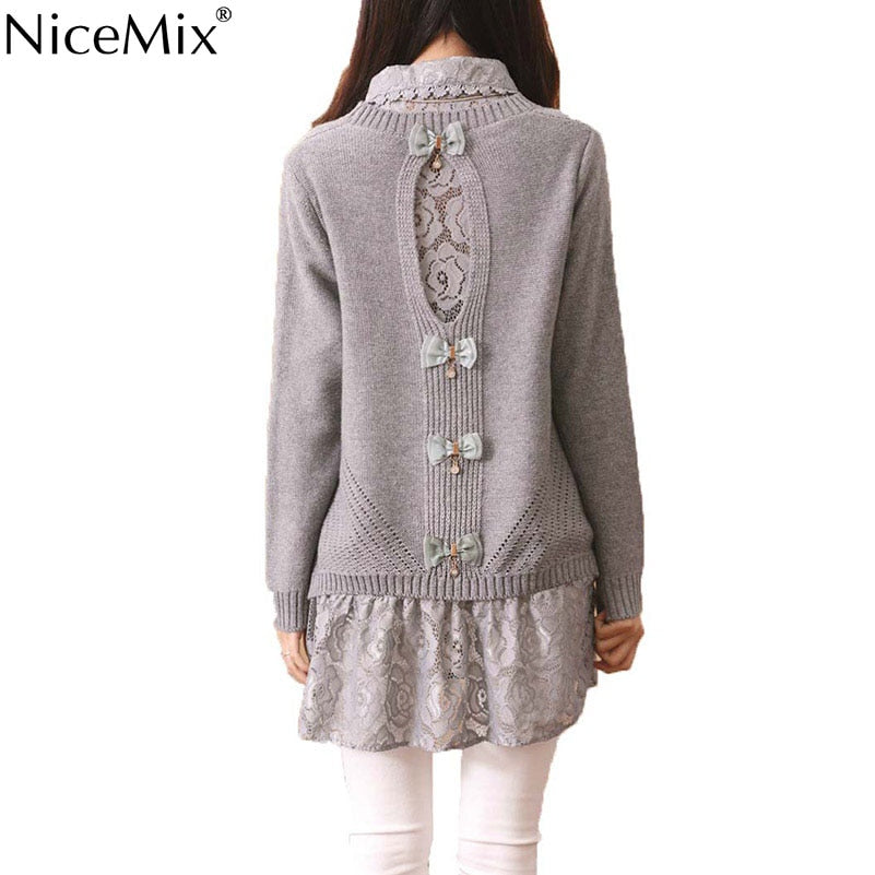 NiceMix Sweet Pullover Sweater Women 2020 Autumn Casual Sweater Lace Dress Set Back Hollow Out Bow Patch Plus Size Long Sweaters