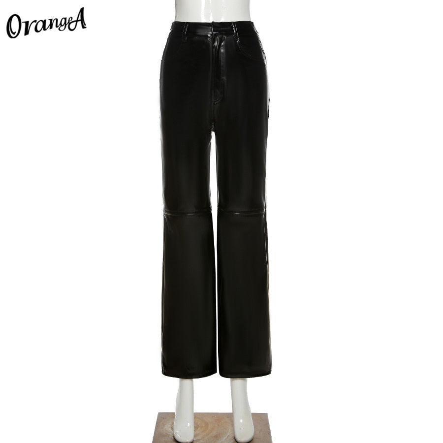 OrangeA Fashion Y2K Faux Leather Pants Women Straight Pockets Summer Elegant High Waist Trousers Office Lady Slim Vintage Pants