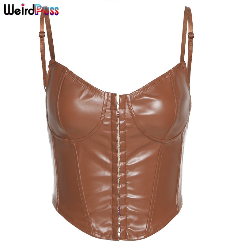 OrangeA Women PU Y2K Leather Corset Top Sexy Sleeveless Skinny Solid Casual Camisole Fashion High Street Party Clubwear Tank