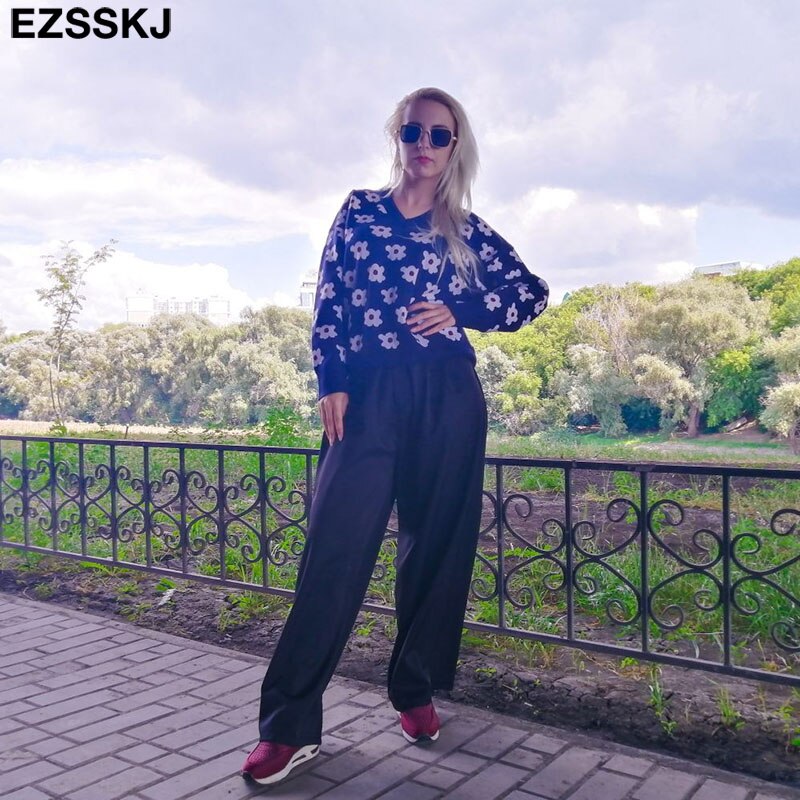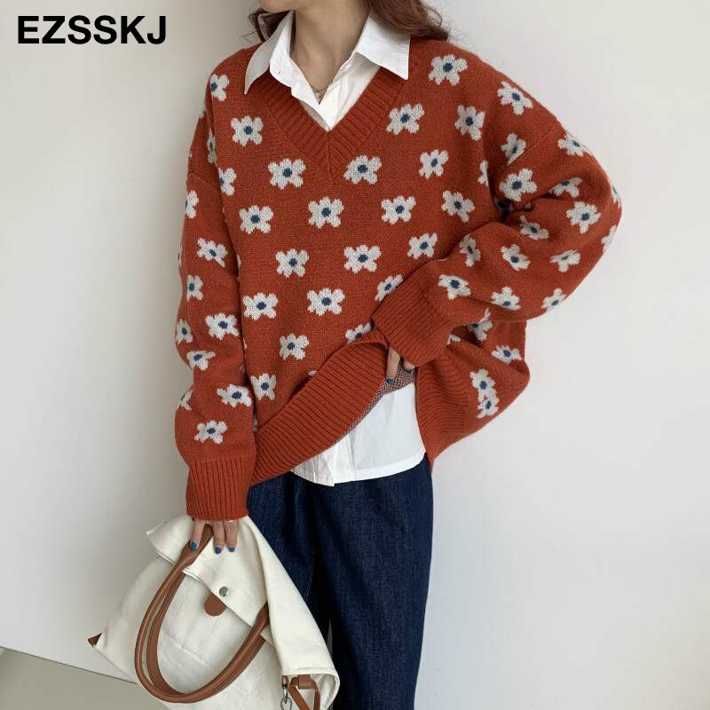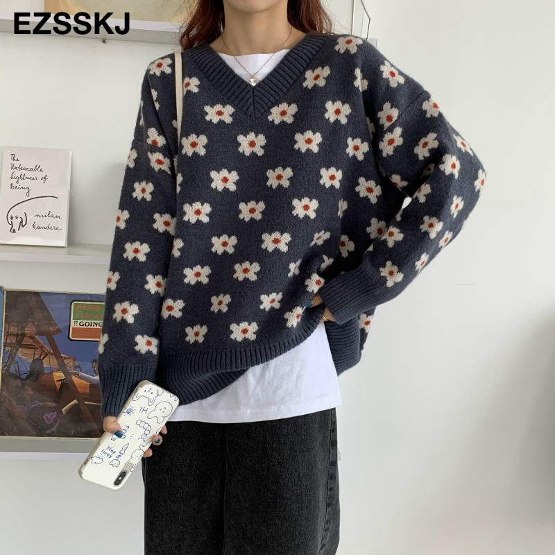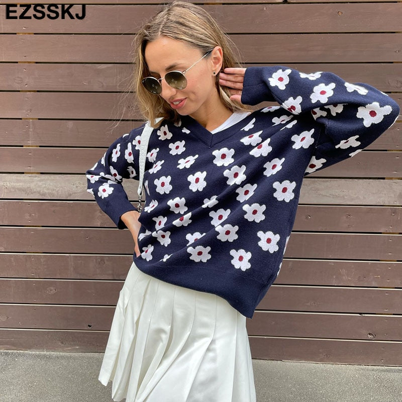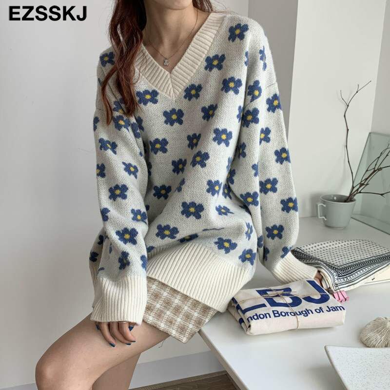 oversize blue floral Sweater Pullovers Women winter autumn thick v-neck chic 2021 sweater long sleeve sweater top