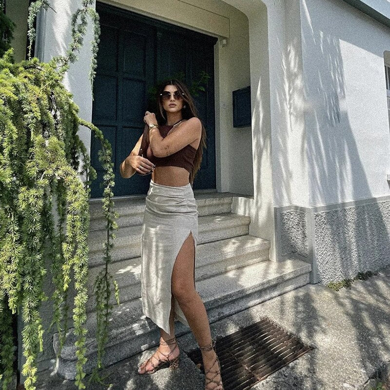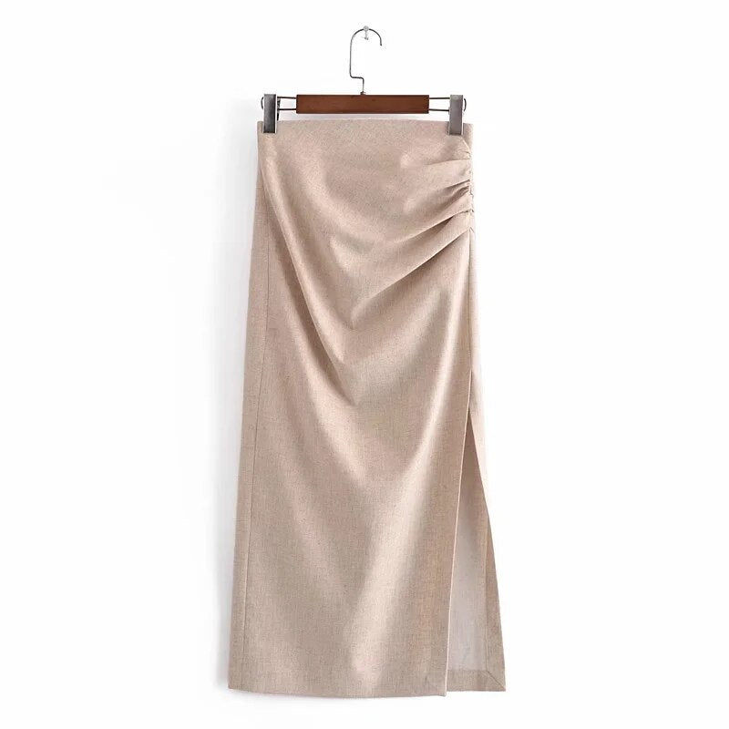 SLMD Stylish Chic Beige Linen Shirts Skirts Suits Women 2021 Fashion Lapel Collar Cropped Blouses Ruched Side Split Skirts Sets