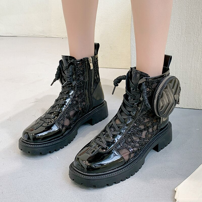 Spring Autumn New Coin Purse Designer Women Ankle Boots Leisure Black PU Mid Heel Ladies Shoes Open Zipper Chain Women Boots