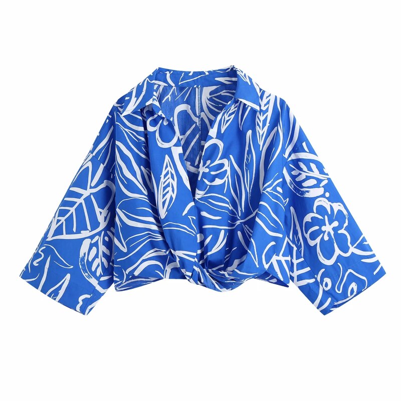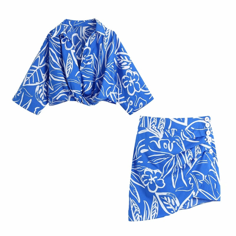 Vintage Chic Blue Print Skirt Sets Women 2021 Summer Fashion Cropped Knot Shirts Side Buttons Ruched Skirts Set
