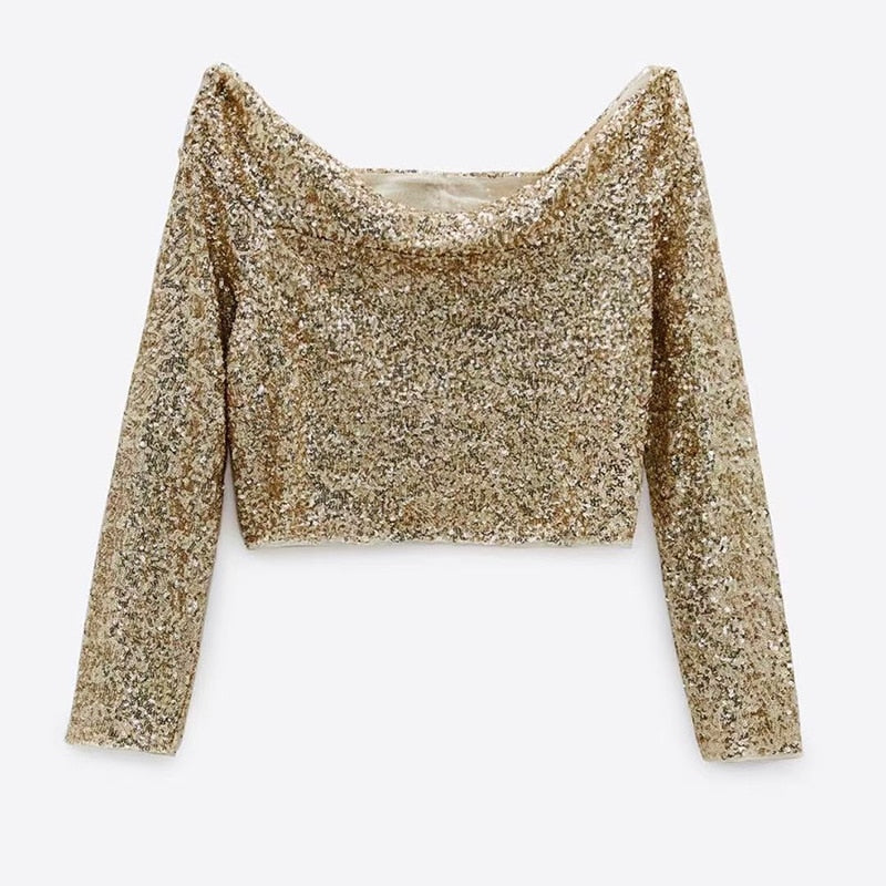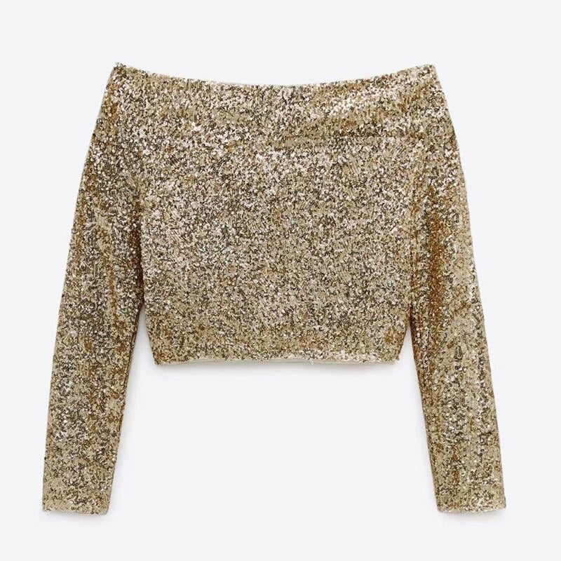 Vintage Chic Gold Sequined Cropped Blouses Women Fashion Sexy Slash Neck Shirts Elegant Ladies Short Tops