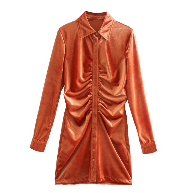 Vintage Elegant Green Draped Velvet Mini Dress Women Fashion Buttons Turn-down Collar Dresses Female Chic Vestidos