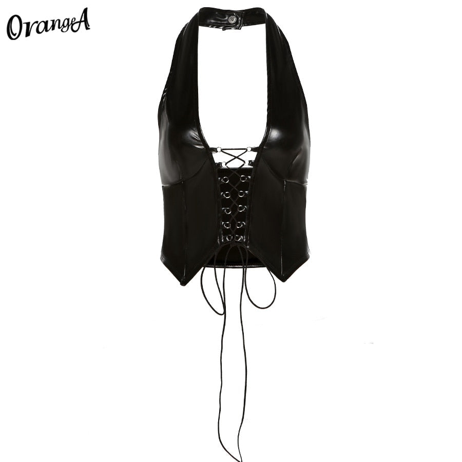 Weird Puss Halter V-Neck Bandage Sexy Y2K PU Leather Croped Crop Fashion Backless Sleeveless Chic Slim Party Clubwear Camisole