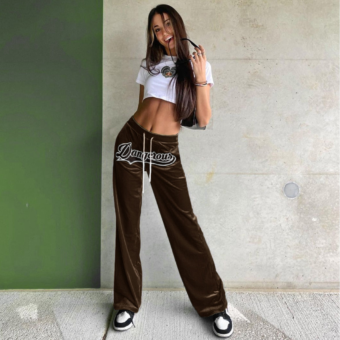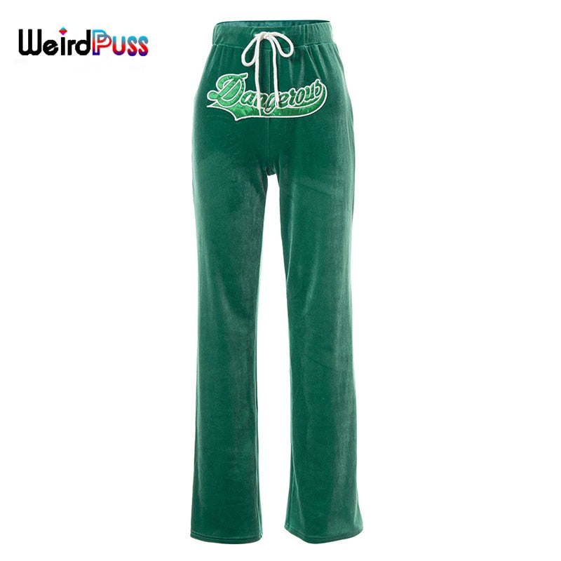 Weird Puss Letter Embroidery Straight Pants Velvet Women Drawstring High Waist Trousers Casual Baggy Wild Streetwear Sweatpants