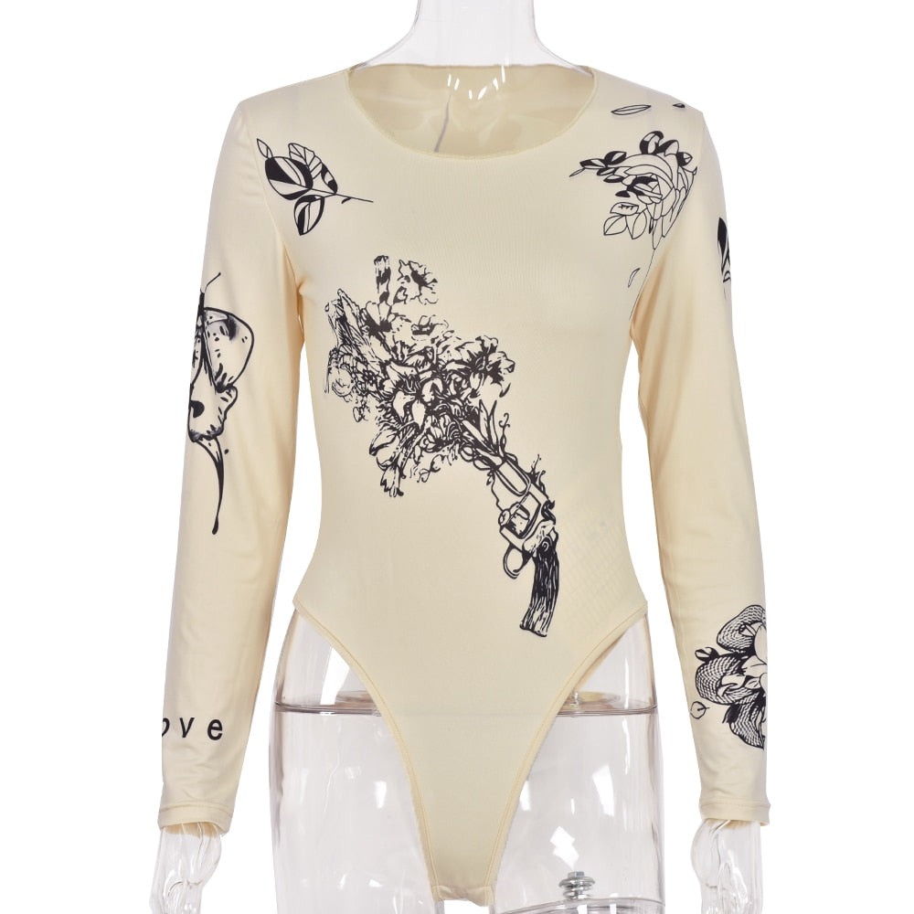 Weird Puss Print O-Neck Autumn Bodysuits Fitness Skinny Long Sleeve Stretch Bodycon Casual Wild Basic Streetwear Sporty Slim Top