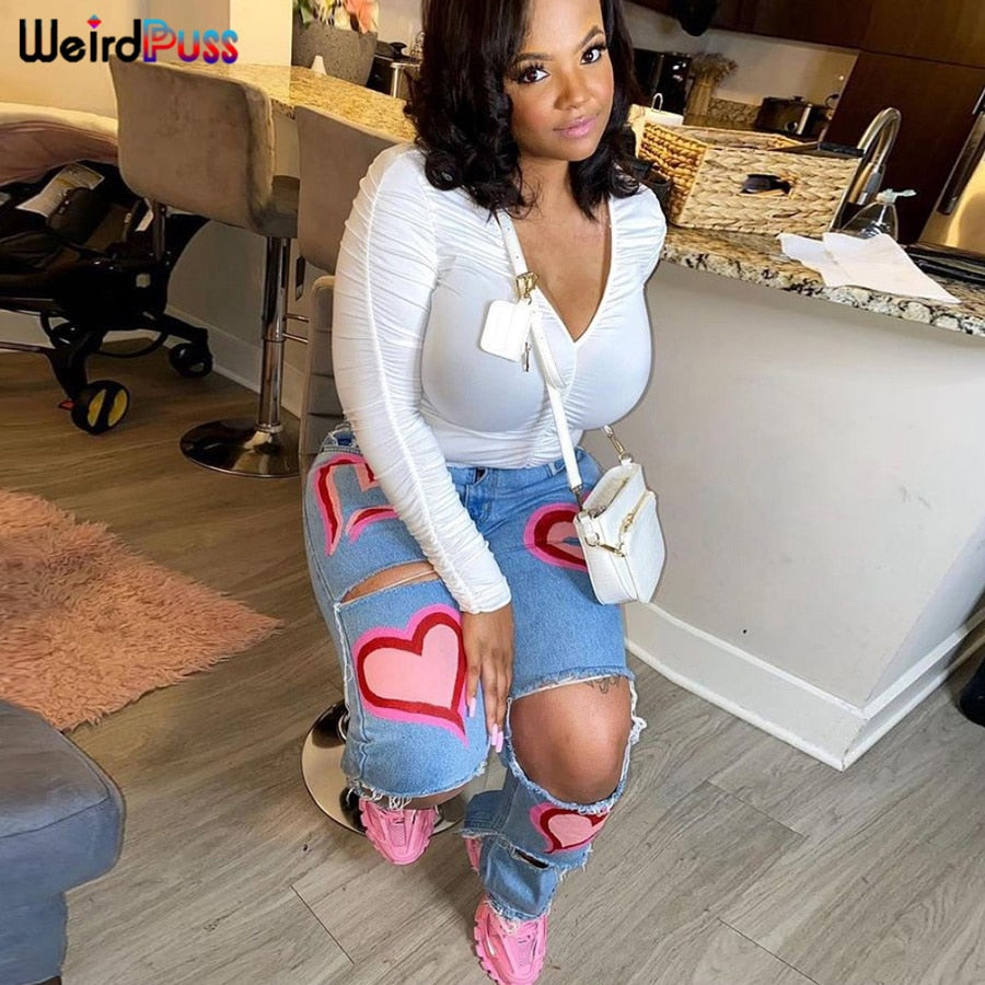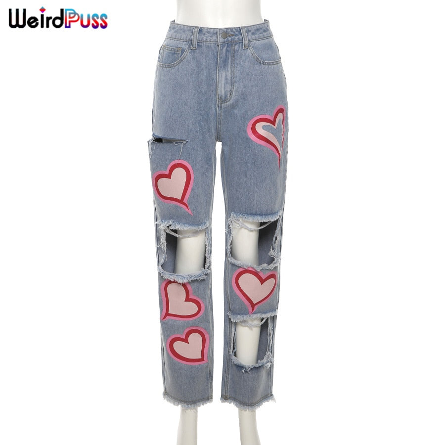Weird Puss Ripped Women High Waist Jeans Hole Heart Irregular Denim Trousers Summer Streetwear Casual Wild Straight Pants 2021
