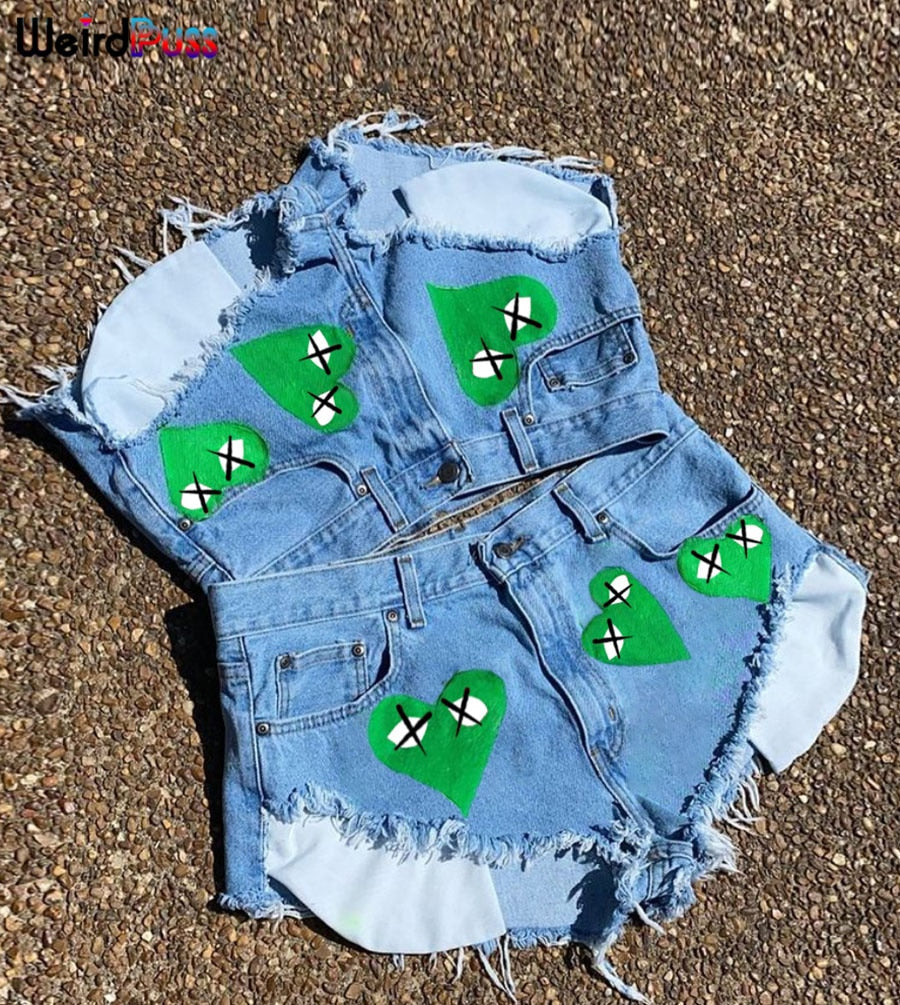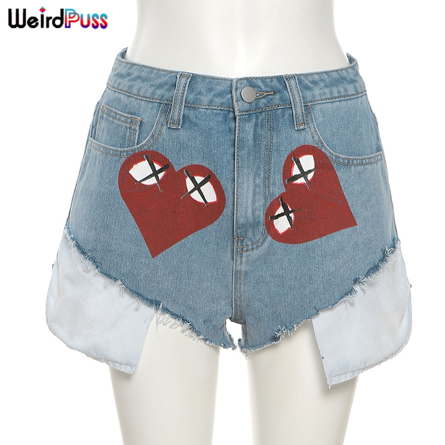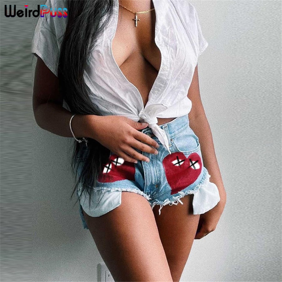 Weird Puss Sexy Heart Print Jean Shorts Women Casual Summer Fashion 2021 Streetwear Fur-Lined Leg-Openings Denim Booty Shorts