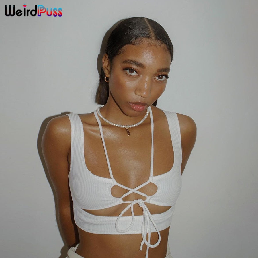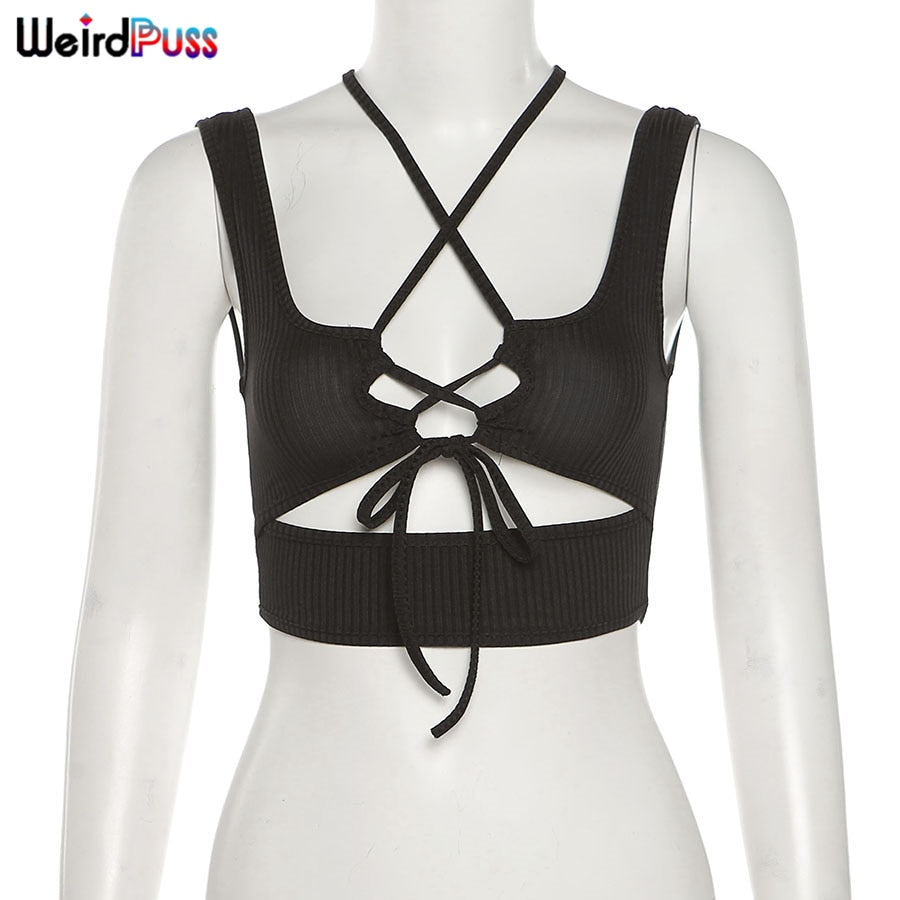 Weird Puss Sexy Hollow Cyber Y2K Tank Tops Women Solid Bandage Vest Sling Ribbed Summer Party Clubwear Stretchy Skinny Outfits
