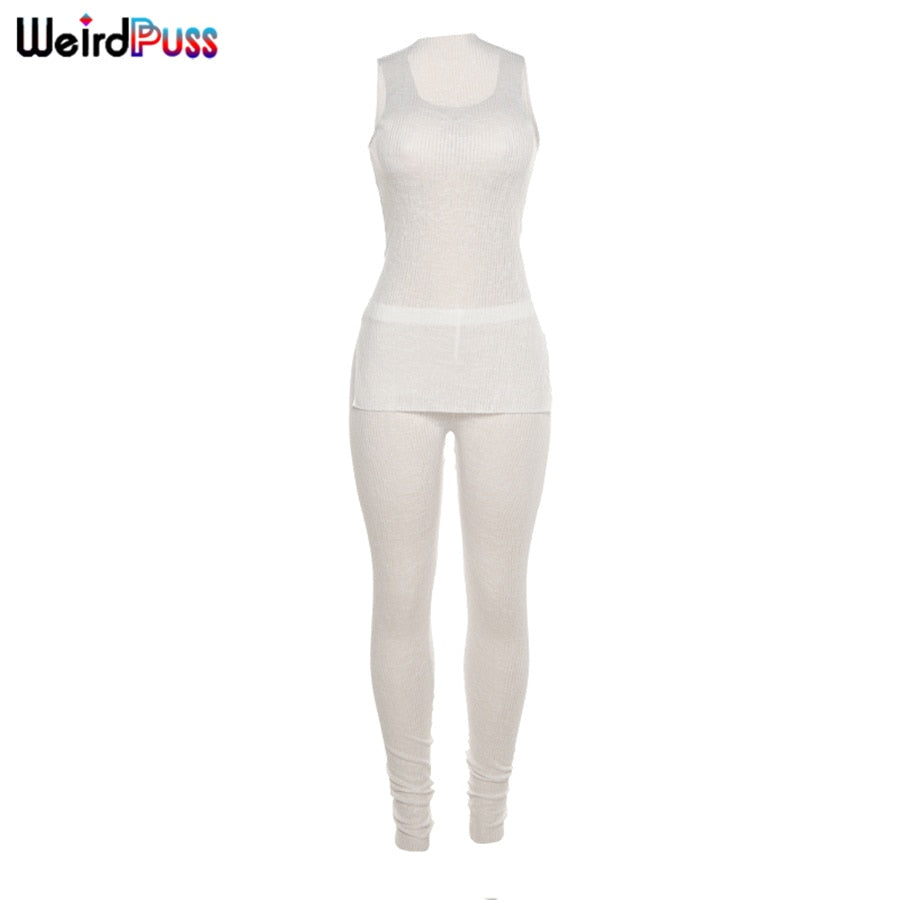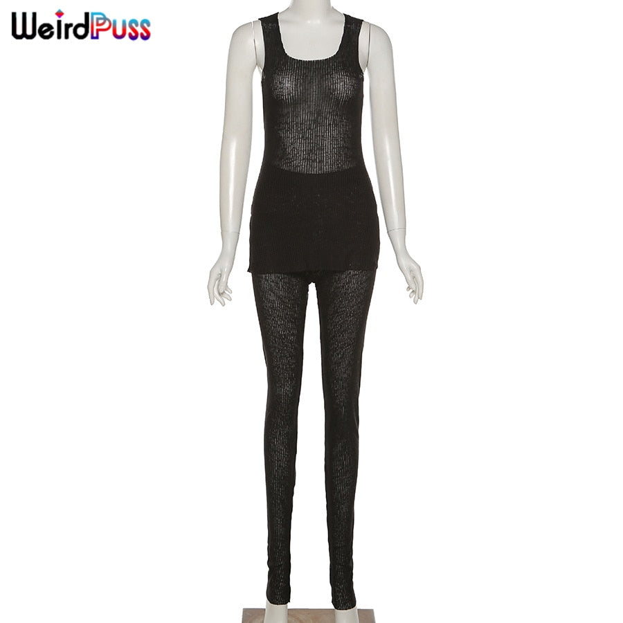 Weird Puss Two-Piece Sets Women Knitting Ribbed Sleeveless Split Tops+High Waist Pants Thin Summer Sporty Suit Casual Streetwear
