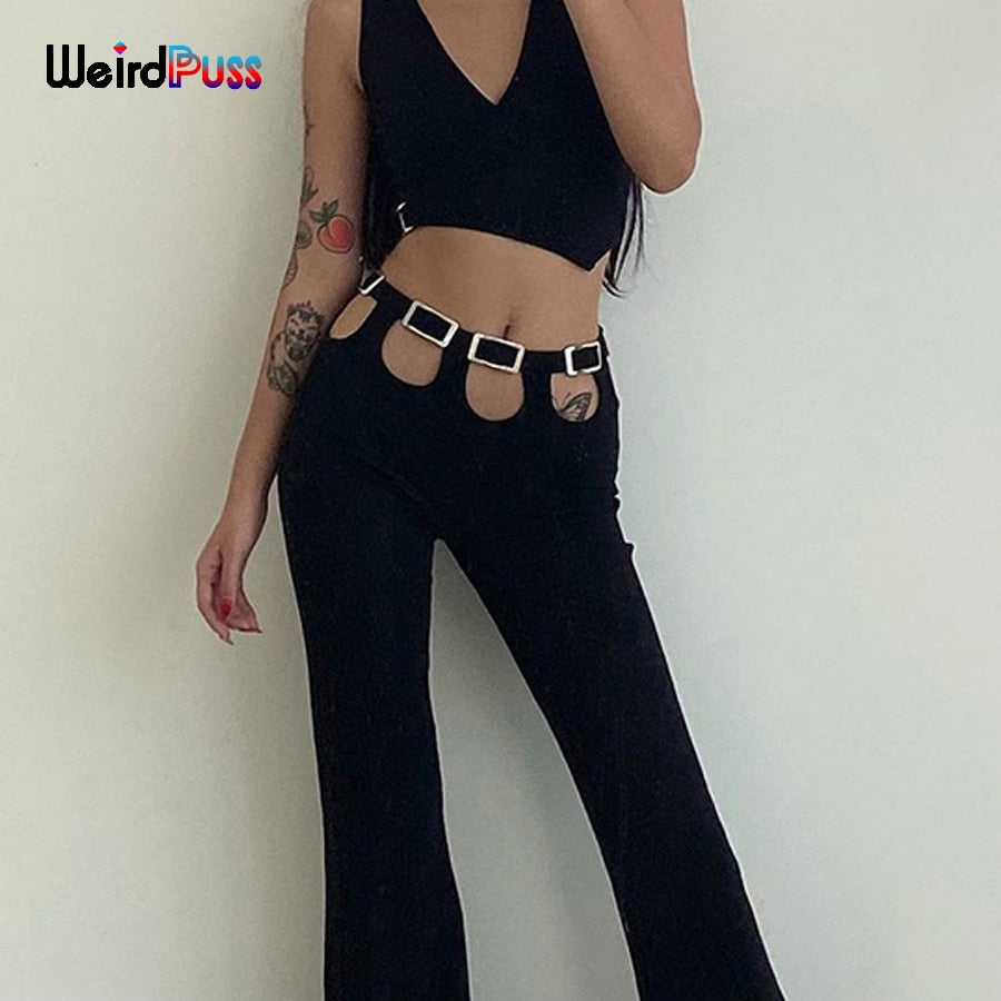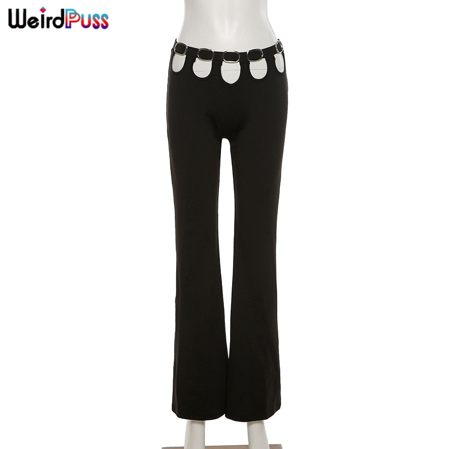 Weird Puss Y2K Chic Button Mid Waist Pants Women Summer Hollow Out Streetwear Flare Pants 2021 Fashion Casual Skinny Trousers
