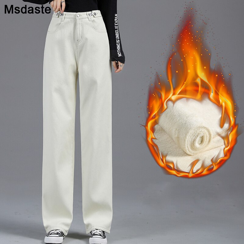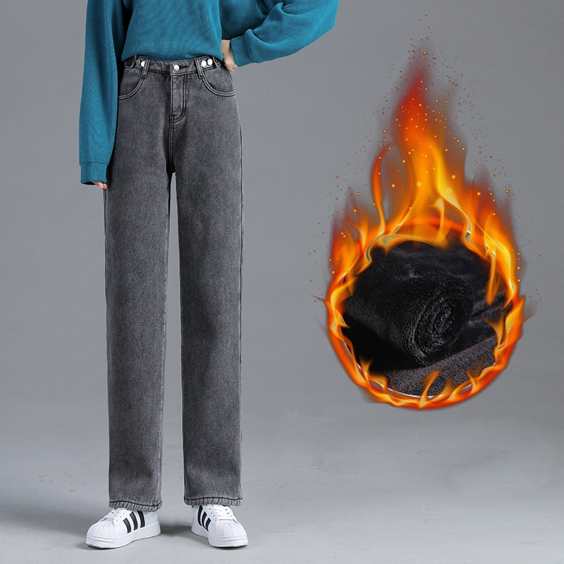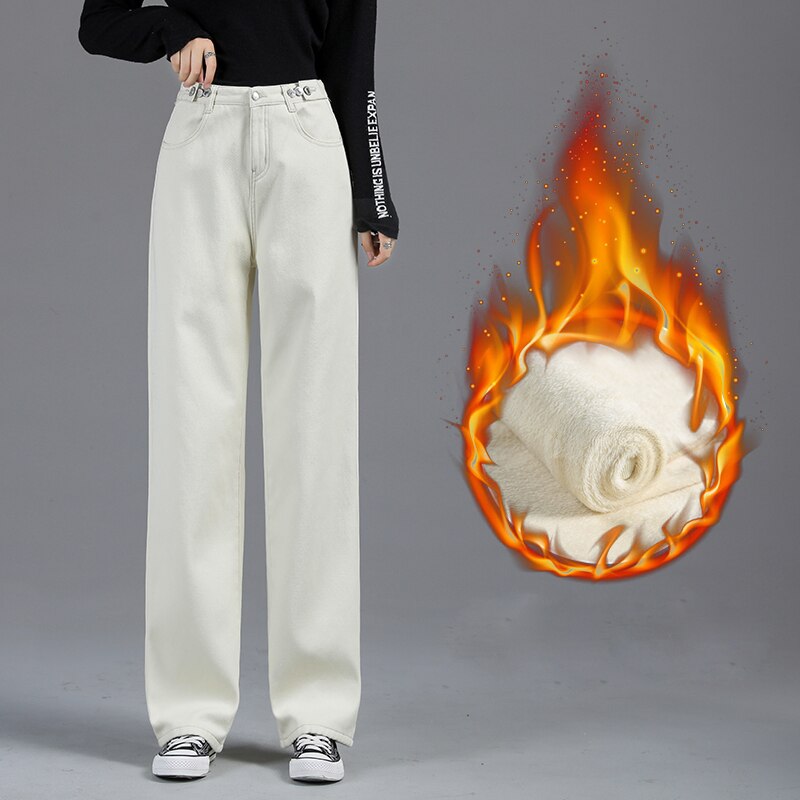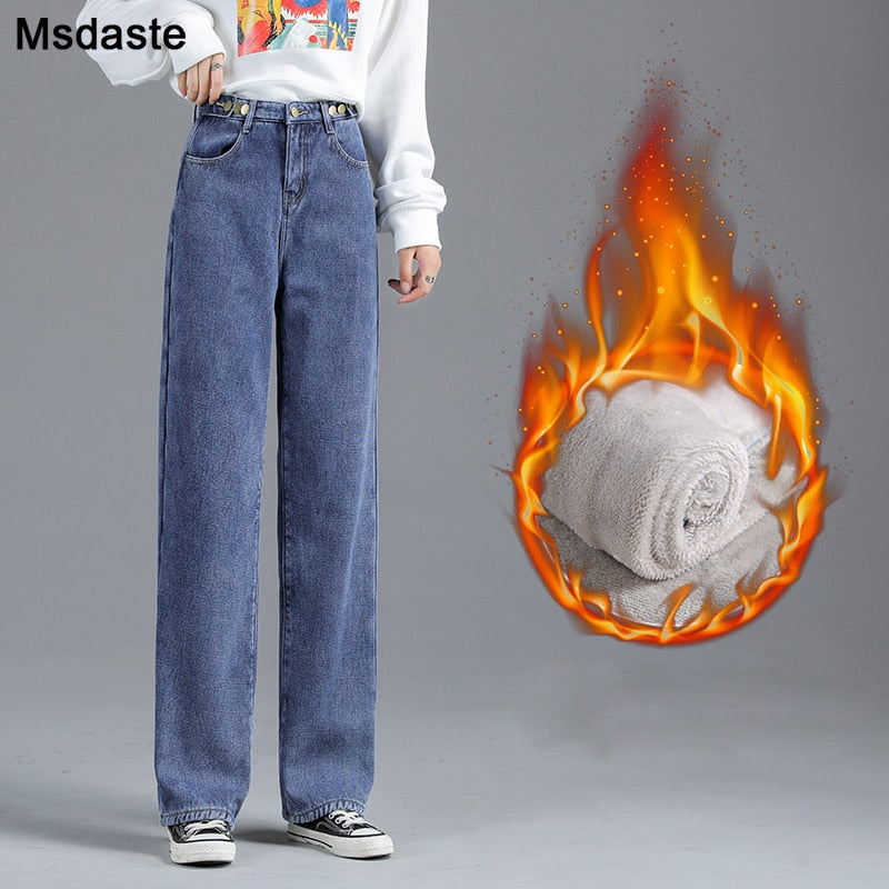 Winter Jeans Women Warm Denim Trousers High Waist Casual Loose Female Denim Pants Thick Velvet Cotton Wide Leg Woman Jeans