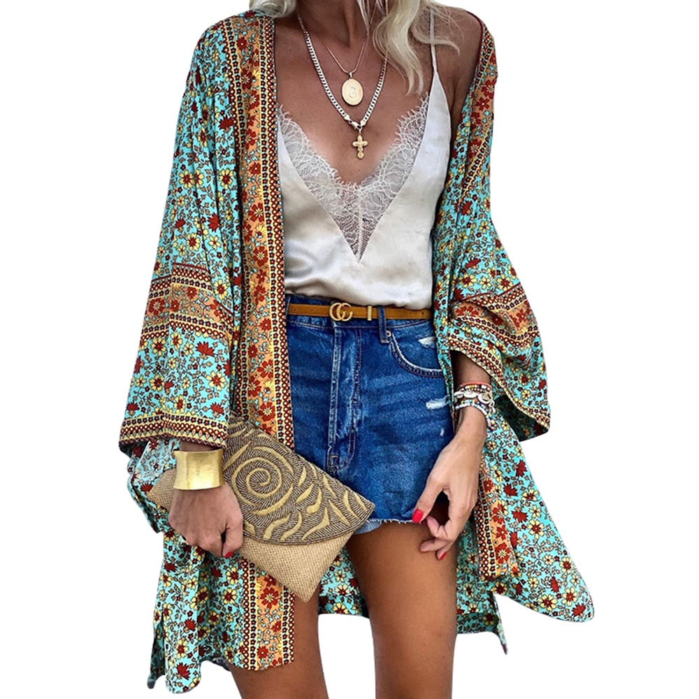 Women Boho Print Floral Beachwear Kimono Cardigan Loose Long Sleeve Shawl Capes Blouse Bikini Cover Wrap Outdoor Thin Coat D30