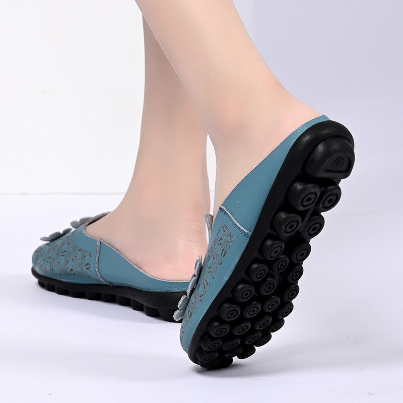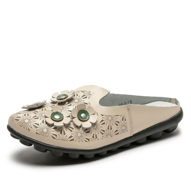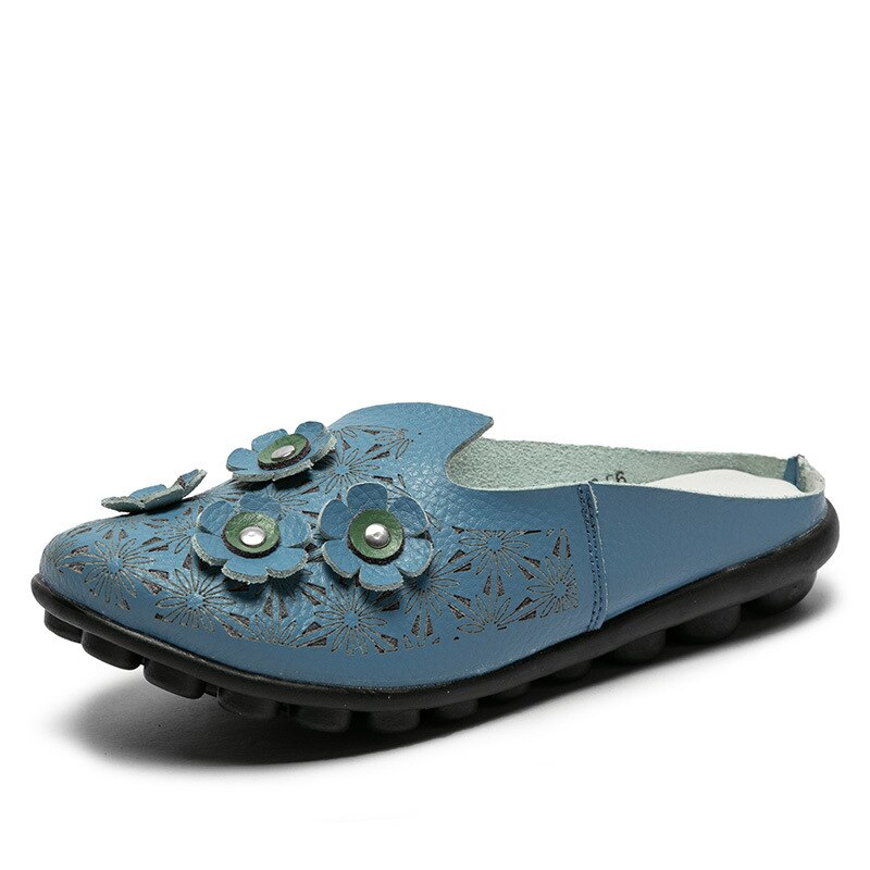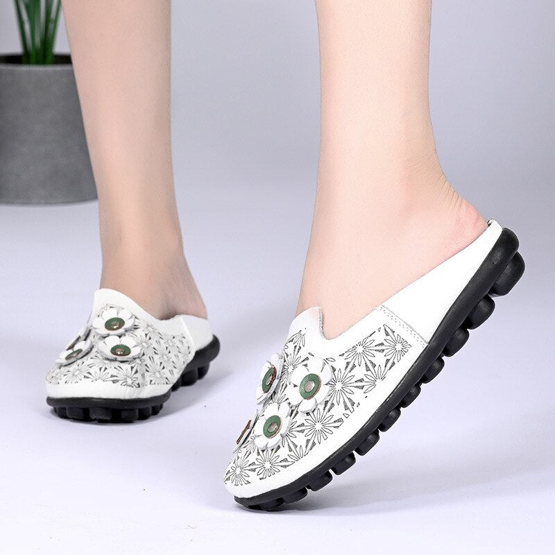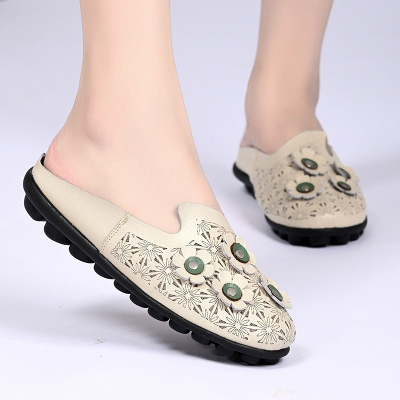 Women Flats Hollow Shoes Slip On Leather Loafers Ladies Shoes Genuine Leather Shoes Korean Style Soft Moccasins Half Slippers