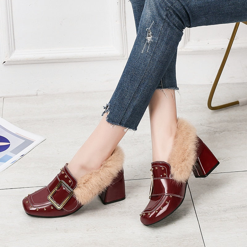 Women High Heel Casual Shoes Fashion Fur Decoration Rivet Pumps Buckle Office Ladies Shoes Warm Women Party Wedding Fur Shoes