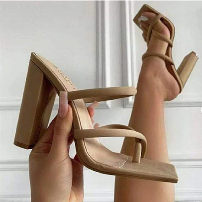 Women Sandal Summer Sprint Strappy Heels Sandals Slippers Women High Heels Flip Flops Square Toe Slides Party Shoes Lady Brown