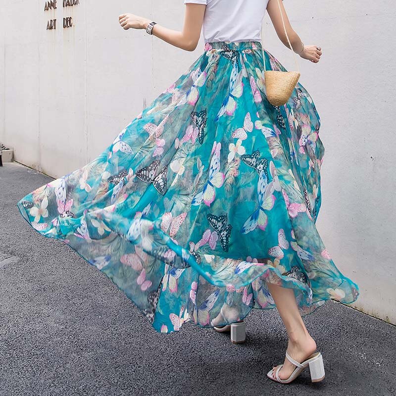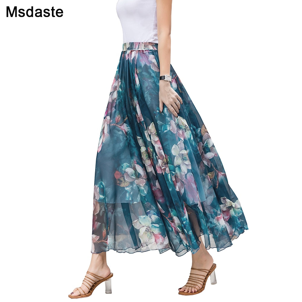 Women Skirts 2019 Summer Mesh Flower Print Elastic Waist Bohemian A-Line Sweet Chiffon Long Female Bottoms Ladies Casual Skirt