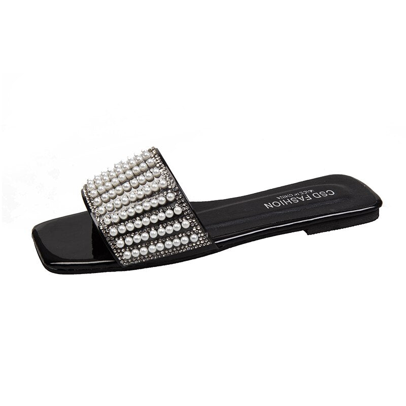 Women Slippers Summer Rhinestone White Flat Shoes Elegant Pearl External Wear 2021 Summer New Sandy Beach Sandals Women Shoes