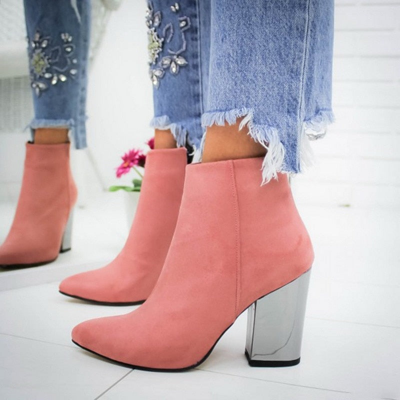 Women's Boots Pointed High Heels Shoes Solid Color Leather Ankle Boots Female Boots Fashion Thick Heel Side Zipper Women Shoes